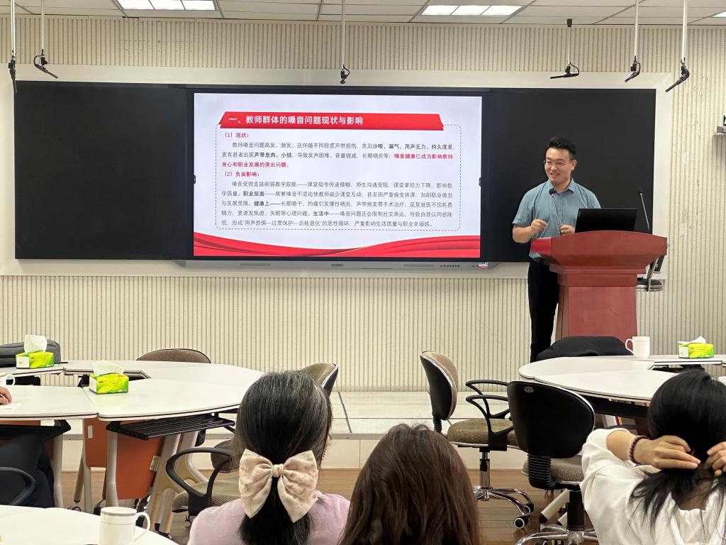 在示范课环节,肖宗恒首先剖析了教师群体普遍存在的嗓音问题现状及其对教学工作的影响;随后通过生动演示,解析了人体嗓音的生理构造与发声机制;最后结合临床案例,详细列举了教师职业中常见的嗓音损伤诱因。在理论阐述基础上,肖博士重点分享了"科学用声五步法"和"嗓音修复训练体系",现场示范了针对不同教学场景的声带保护技巧。在互动交流环节,肖博士就教师们提出的"慢性咽炎防治""高强度授课后的声带恢复"等具体问题,逐一给予了专业解答和个性化建议。本次教学沙龙既有理论高度又具实践价值,对提升教师的教学质量和职业健康具有重要指导意义。